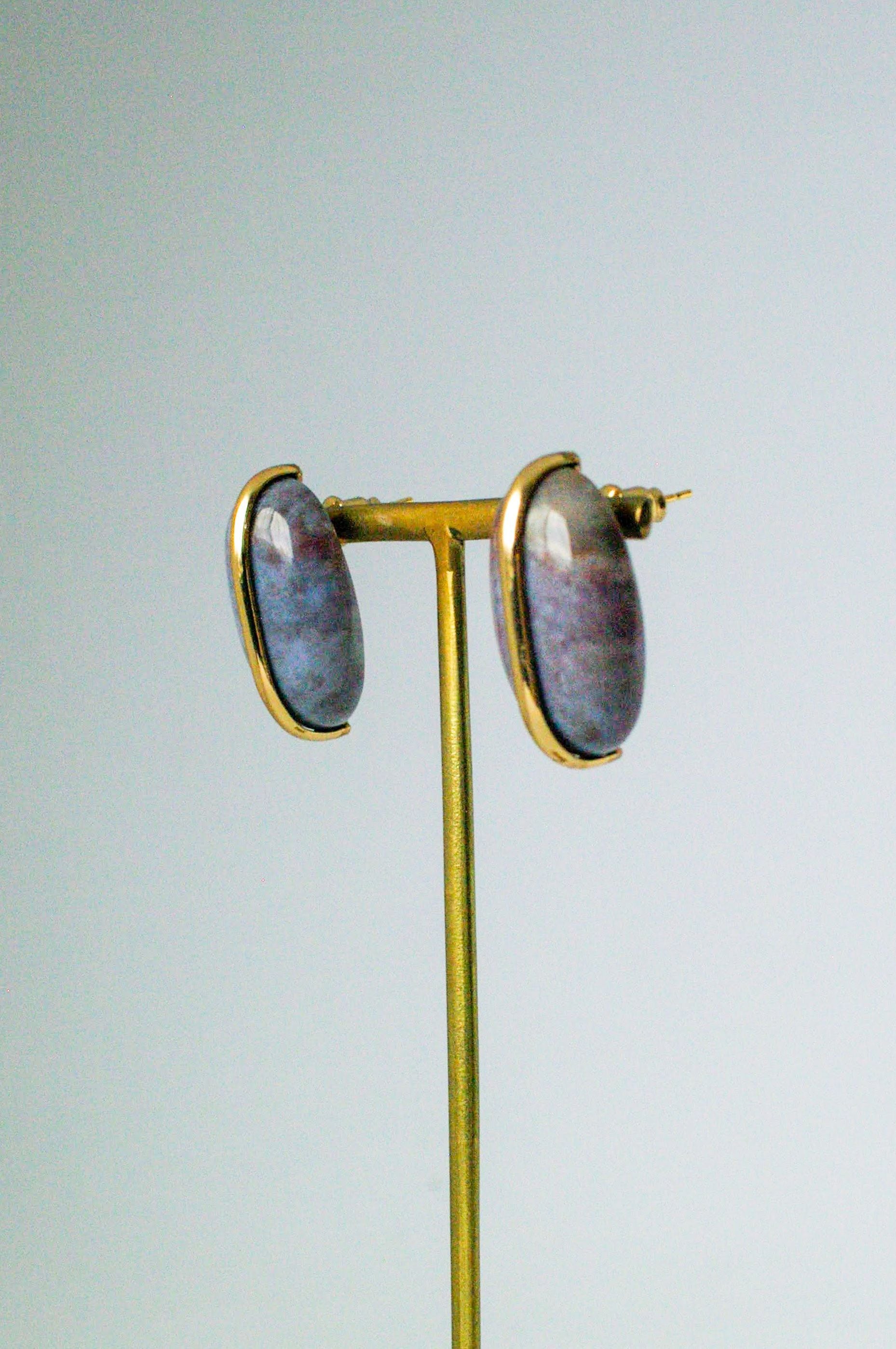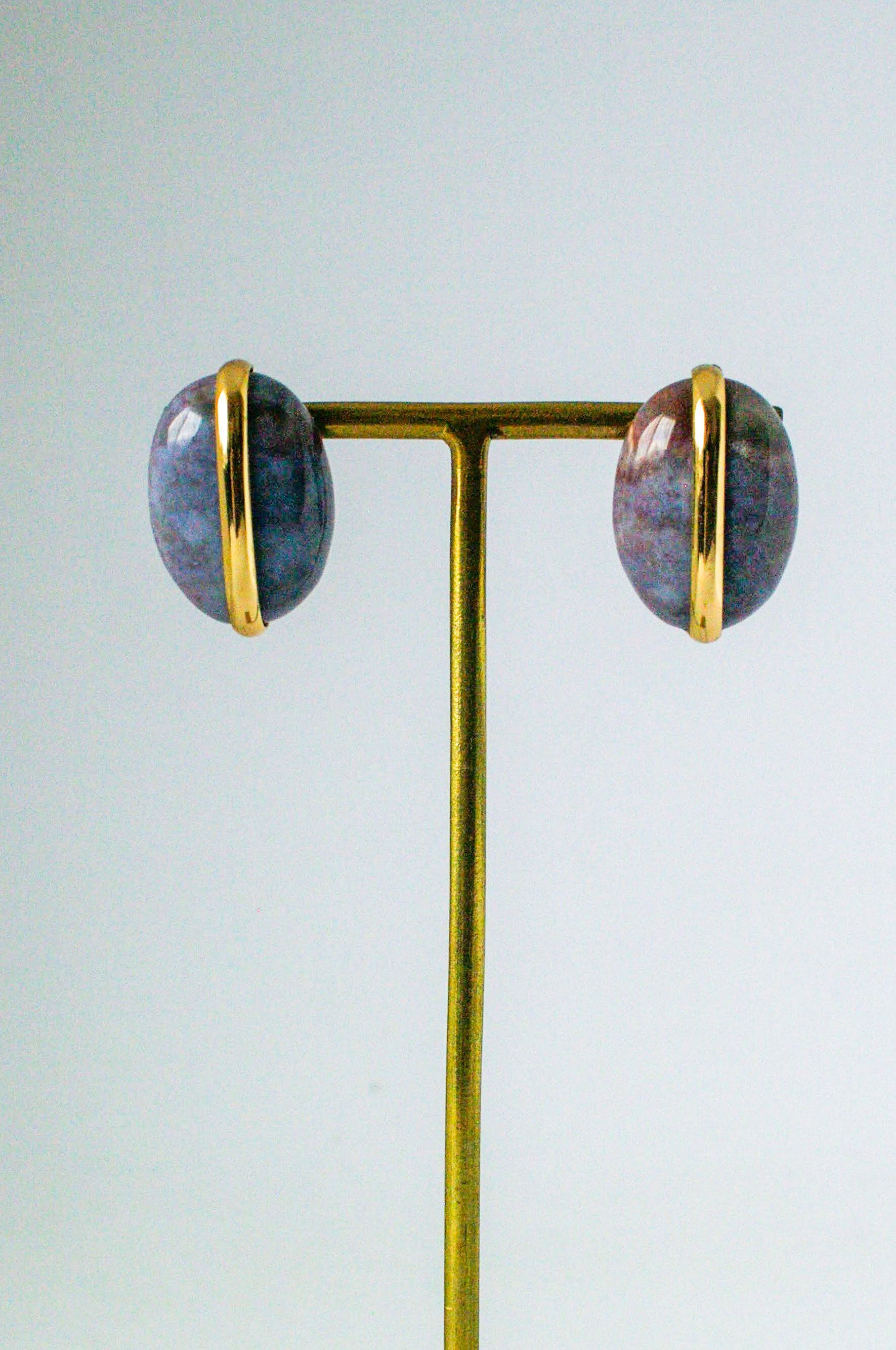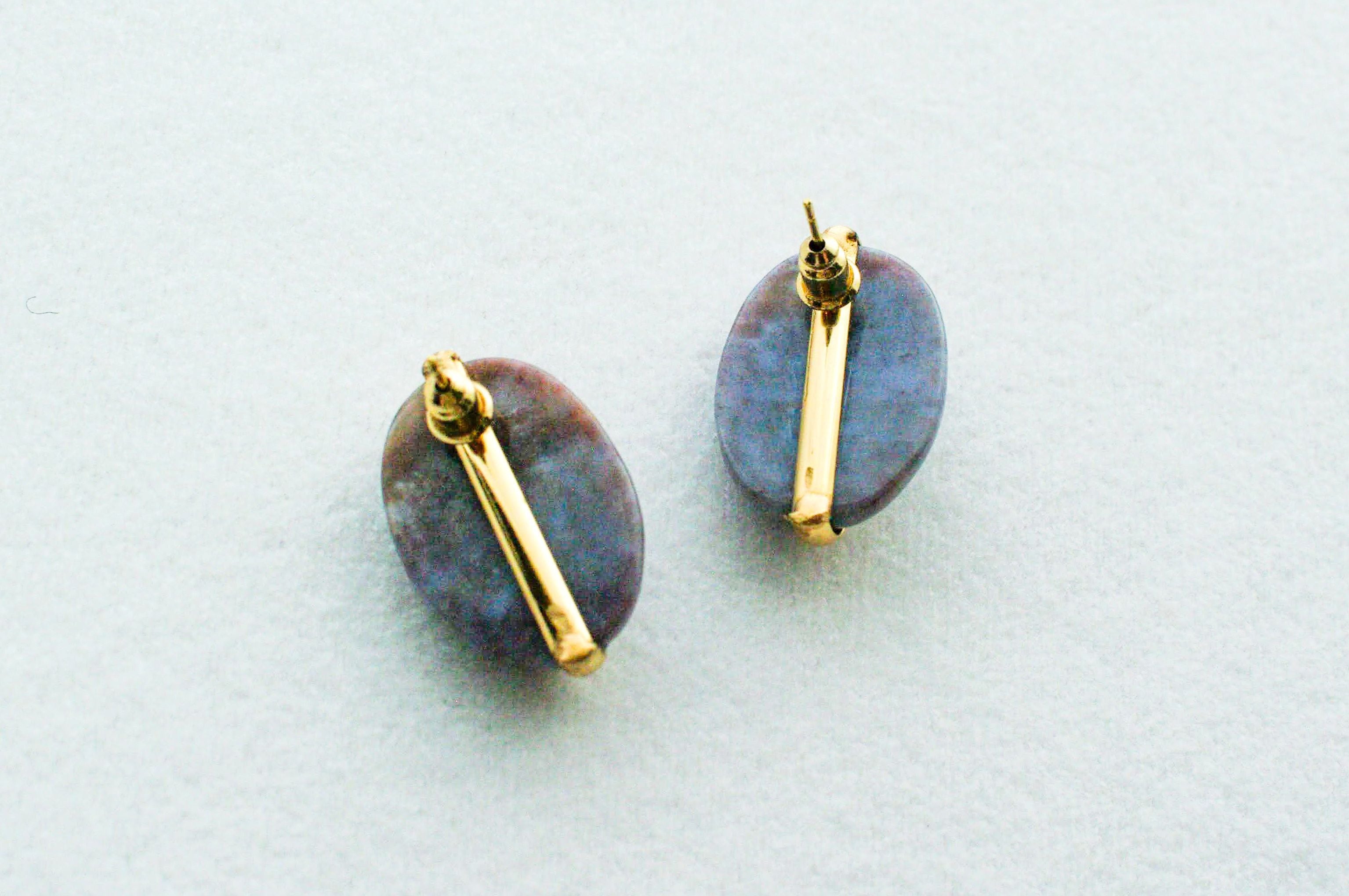 グレーにピンクがまじりあったようなニュアンスのある色味が個性的なユナカイトのピアス。センターのゴールドが効いたモダンなデザインは幅広いスタイルに合わせていただけます。