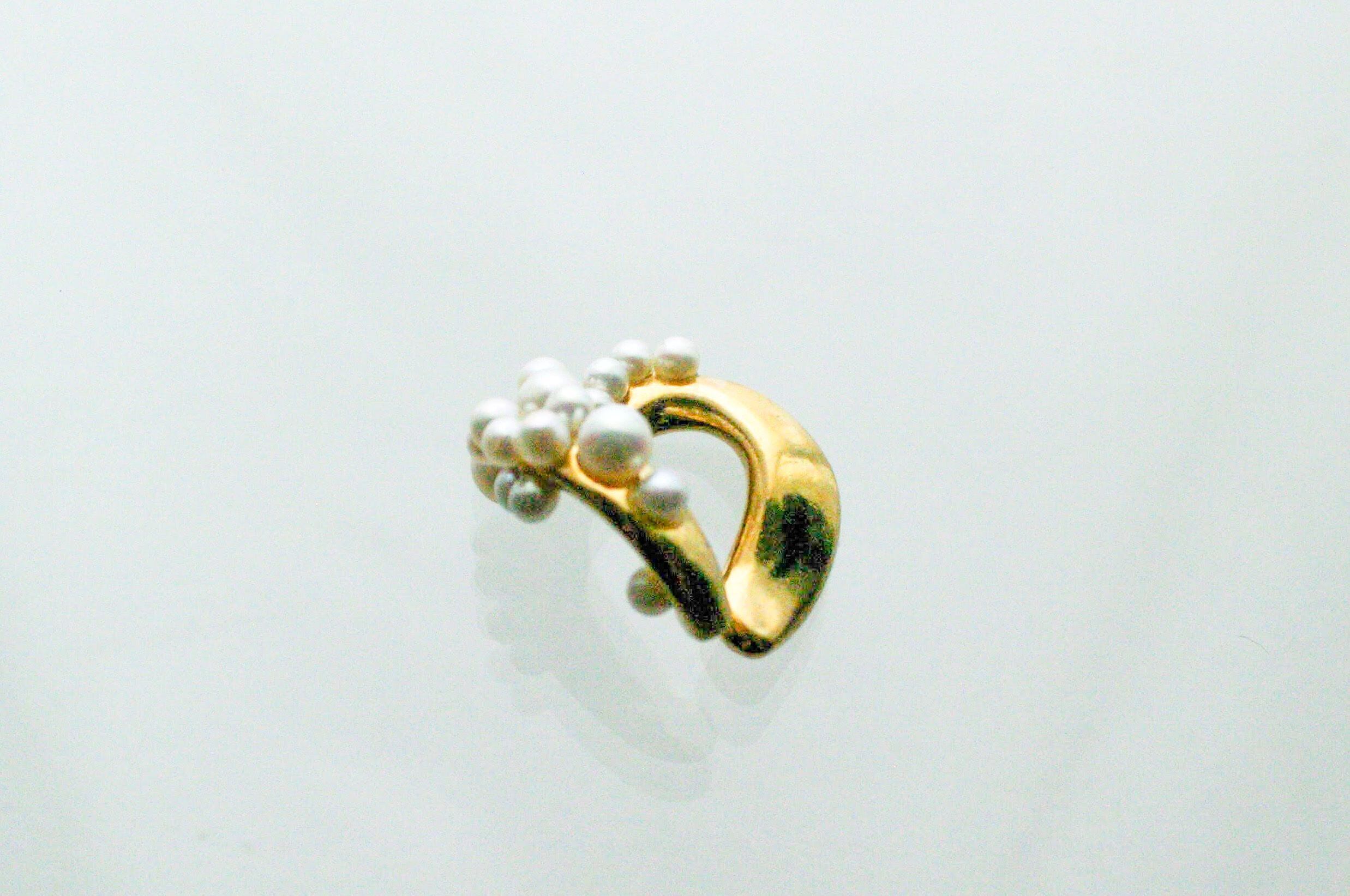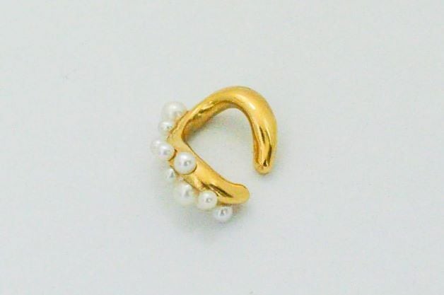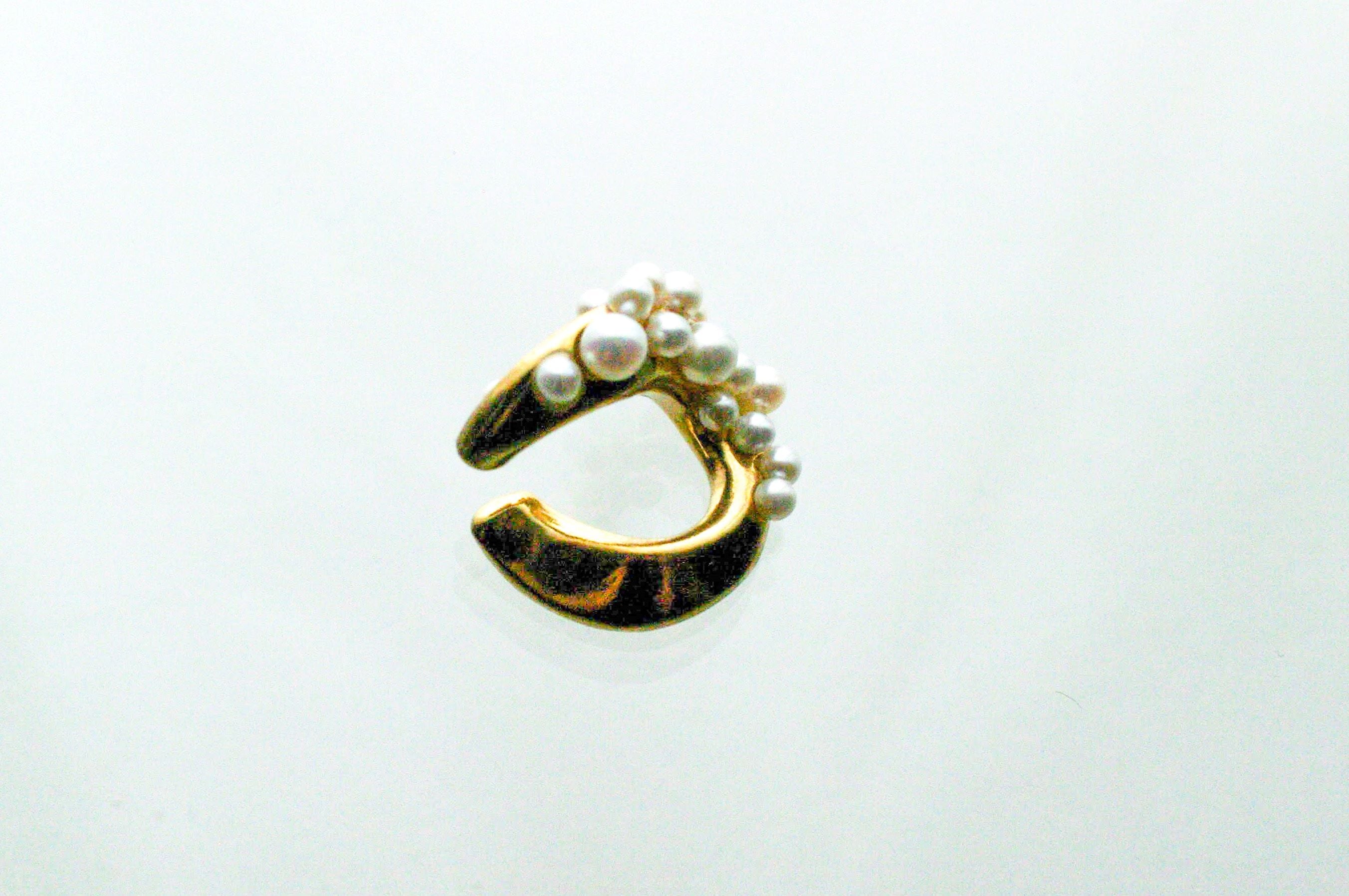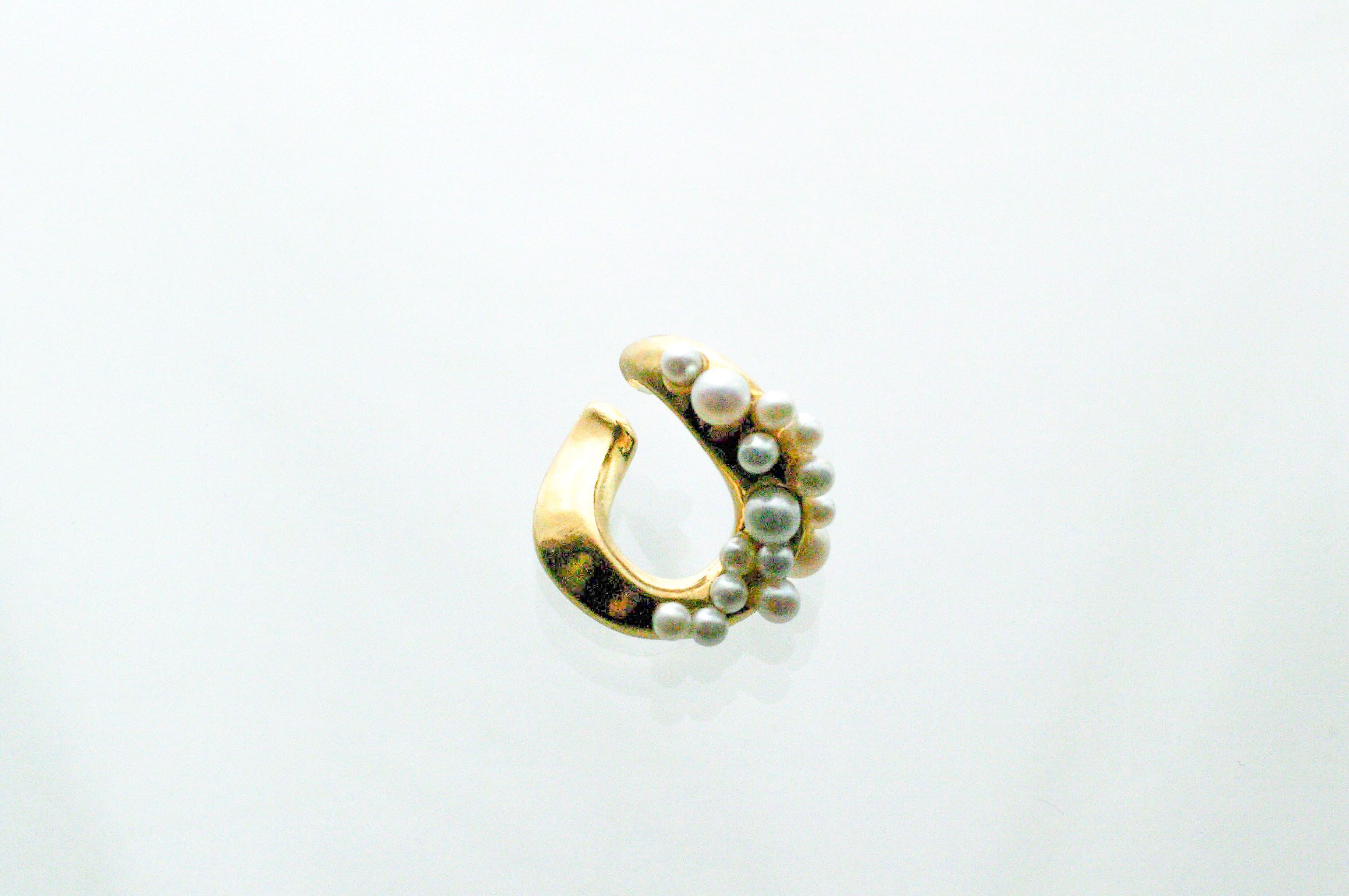 いくつかの淡水パールが埋め込まれたイヤーカフは印象的な耳周りに。